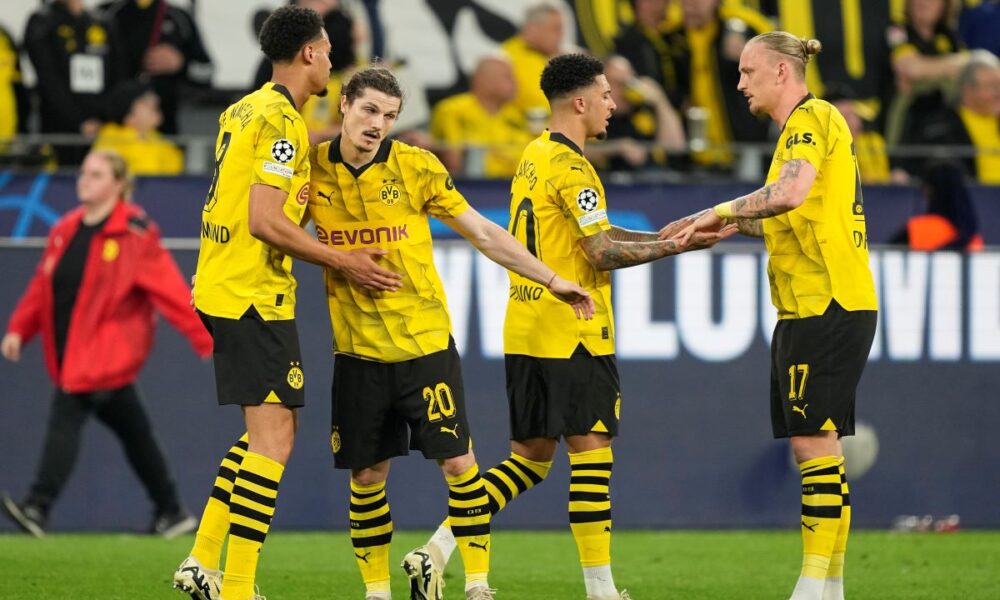 Dortmund's players celebrate after the Champions League semifinal first leg soccer match between Borussia Dortmund and Paris Saint-Germain at the Signal-Iduna Park in Dortmund, Germany, Wednesday, May 1, 2024. (AP Photo/Martin Meissner)