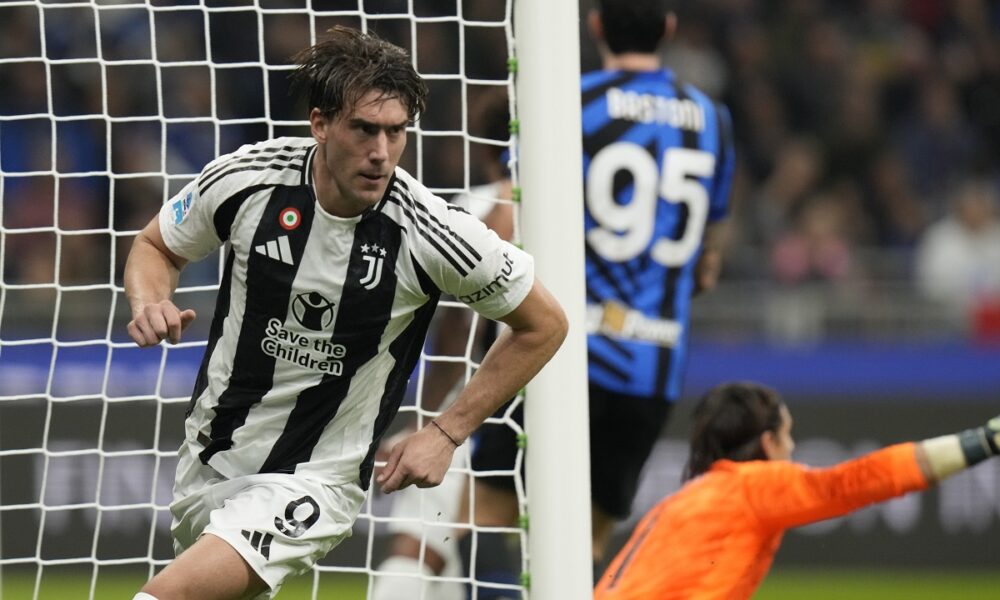 Juventus' Dusan Vlahovic celebrates after scoring his side's opening goal during a Serie A soccer match between Inter Milan and Juventus at the San Siro stadium in Milan, Italy, Sunday, Oct. 27, 2024. (AP Photo/Luca Bruno)