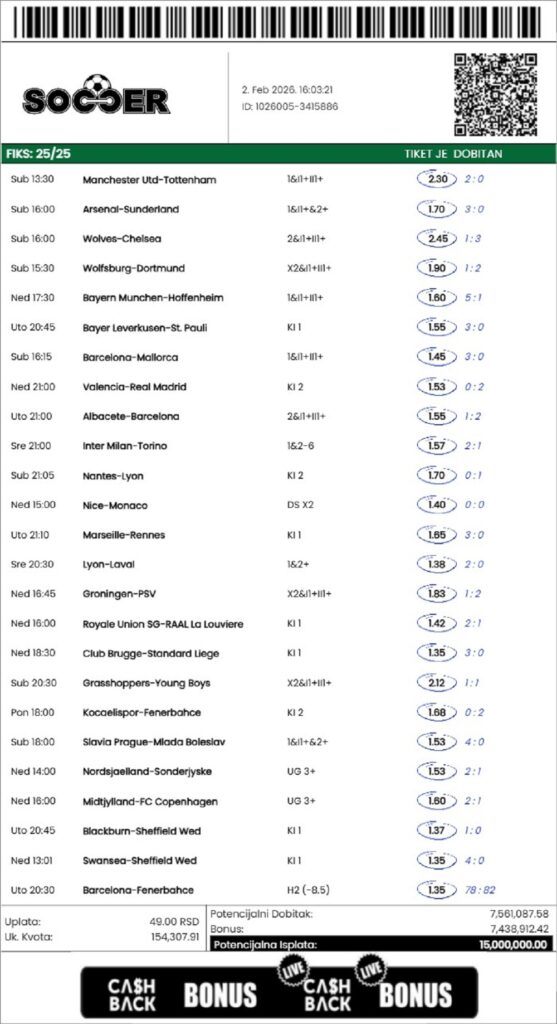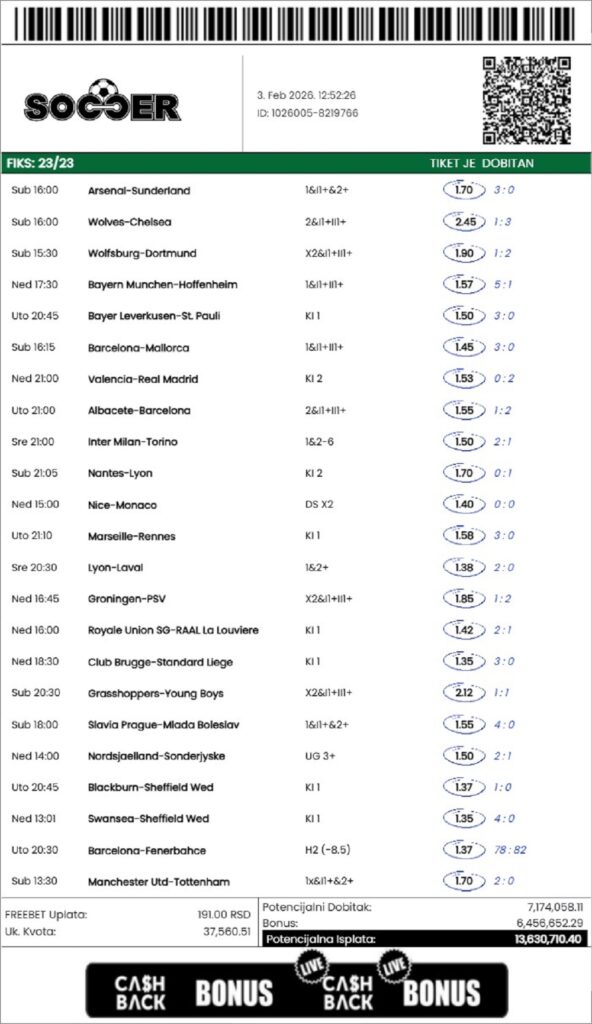 Na jednu freebet uplatu u iznosu od 1.377 dinara dobio je preko 2 miliona dinara. Bio je to tiket sa ukupno 15 odigranih parova. Ukupna kvota je bila 969,1, a poslednji par koji je čekao bila je dvojka na Real u Valensiji koja je došla tek u drugom poluvremenu.