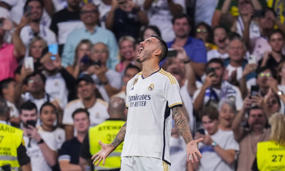 Real Madrid's Joselu celebrates after scoring his side's second goal during a Spanish La Liga soccer match between Real Madrid and Las Palmas, at Santiago Bernabeu stadium, in Madrid, Wednesday, Sept. 27, 2023. (AP Photo/Manu Fernandez)