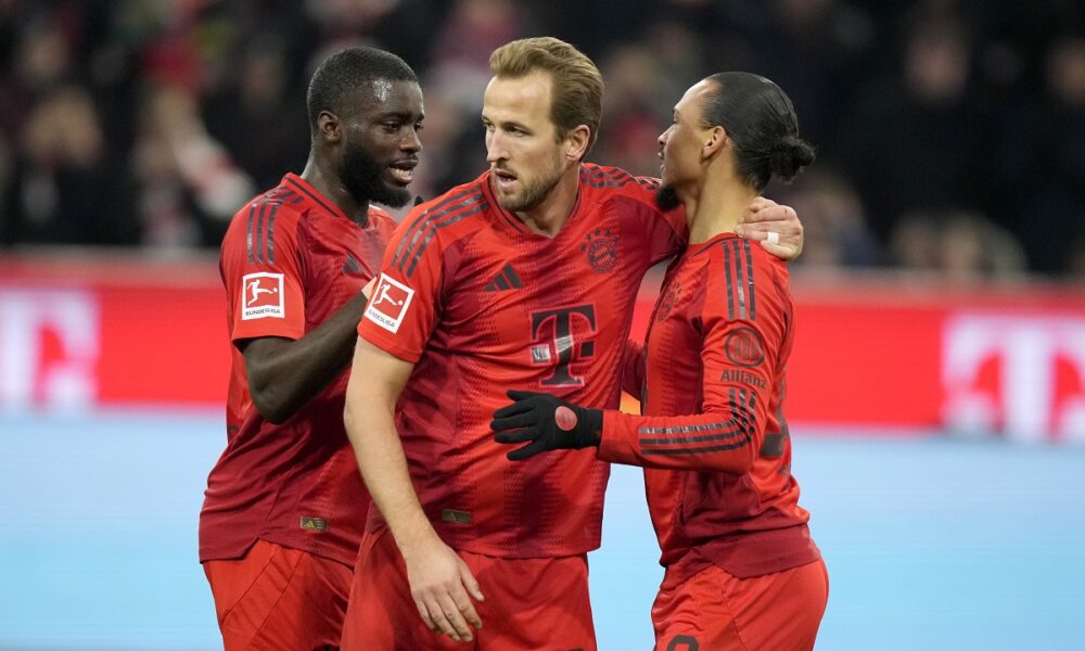 Bayern's Leroy Sane, right, is congratulated by Bayern's Harry Kane, center, after scoring his sides second goal during the German Bundesliga soccer match between Bayern Munich and Werder Bremen at the Allianz Arena in Munich, Germany, Friday, Feb. 7, 2025. (AP Photo/Matthias Schrader)