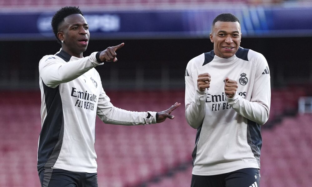 Real Madrid's Vinicius Junior and Kylian Mbappe react, during a training session at the Emirates Stadium, in London, Monday April 7, 2025, a day ahead of the 1st leg Champions League soccer match against Arsenal on Tuesday. (Bradley Collyer/PA via AP)