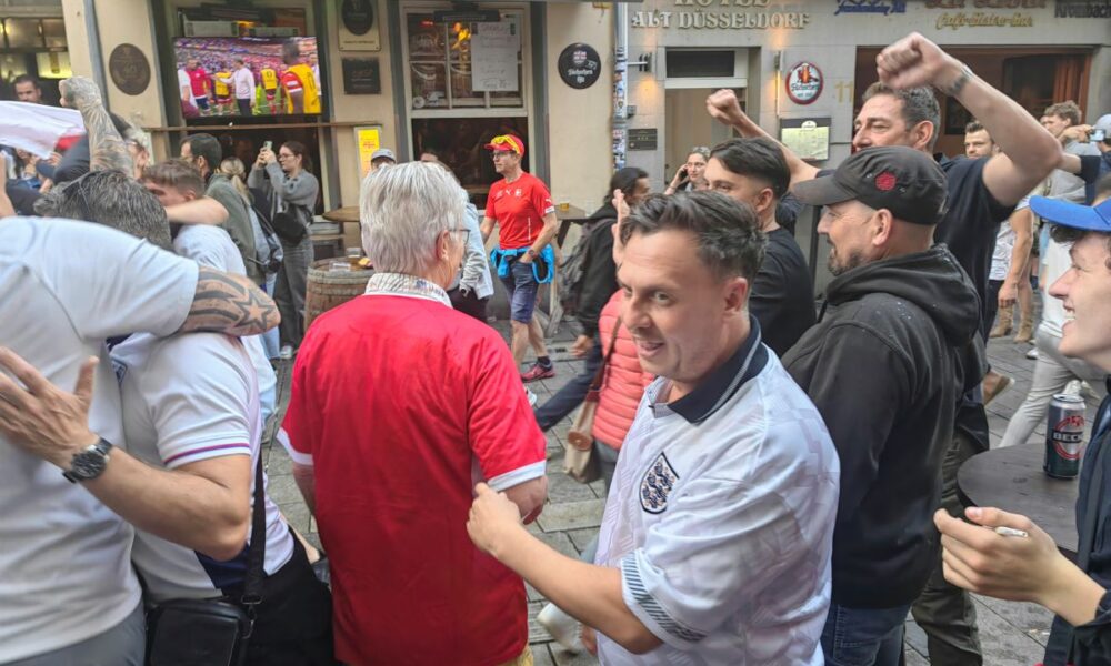 Pisali smo već iskustva sa švajcarskim navijačima pred njihov meč sa Engleskom, ali je na dan četvrtfinala u Diseldorfu mnogo više bilo “ostrvljana”. Budući da je London tek na oko 460 kilometara udaljenosti, a termin odigravanja bio idealan (subota, 18.00), videli smo okupaciju Engleza u borbi za polufinale Evropskog prvenstva.