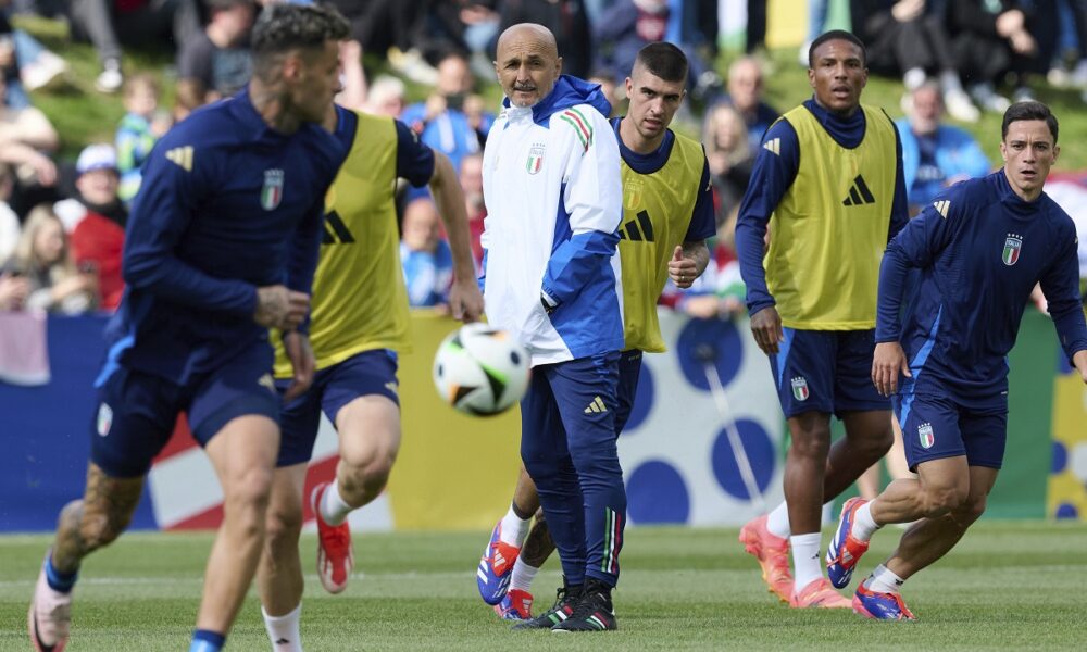Italy's head coach Luciano Spalletti, center, follows the Italian national soccer team's public training session in Iserlohn, Germany, Tuesday, June 11, 2024. (Bernd Thissen/dpa via AP)