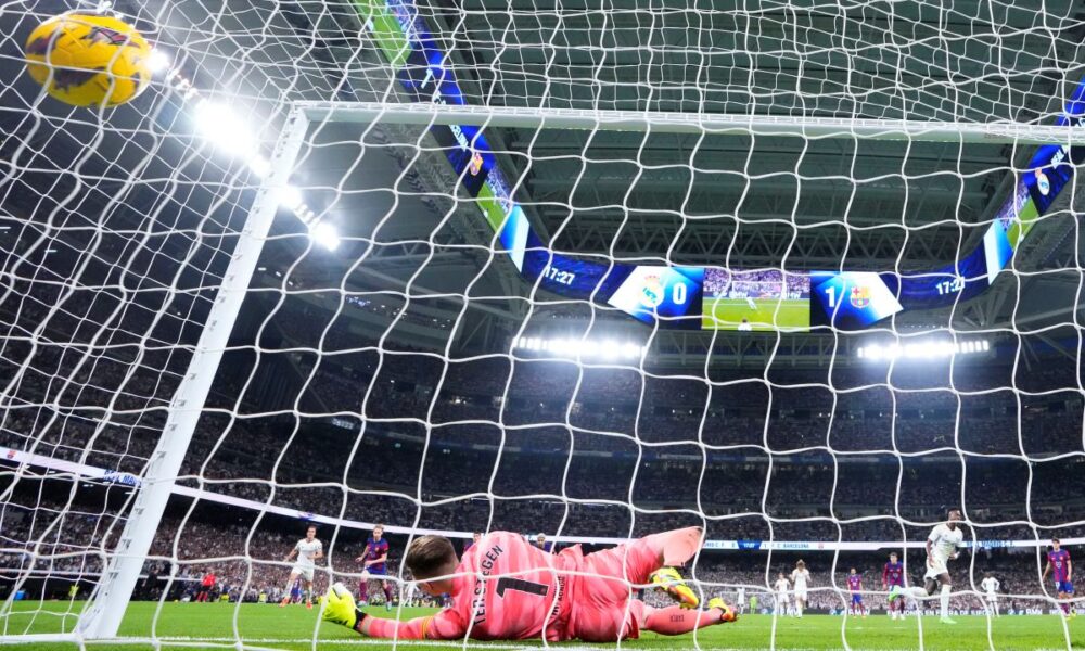 Barcelona's goalkeeper Marc-Andre ter Stegen fails to save the ball as Real Madrid's Vinicius Junior, right, celebrates after scoring his side's opening goal during the Spanish La Liga soccer match between Real Madrid and Barcelona at the Santiago Bernabeu stadium in Madrid, Spain, Sunday, April 21, 2024. (AP Photo/Manu Fernandez)