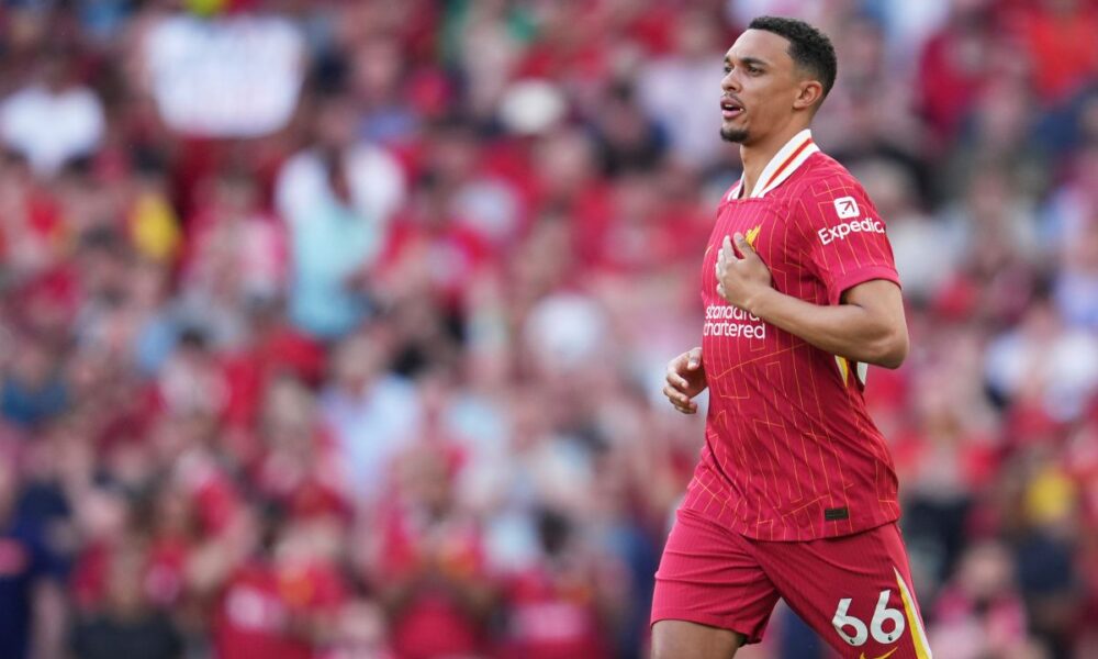 Liverpool's Trent Alexander-Arnold runs during the English Premier League soccer match between Liverpool and Arsenal, at Anfield stadium in Liverpool, England, Sunday, May 11, 2025. (AP Photo/Jon Super)