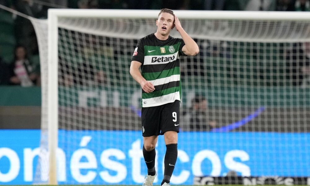 Sporting's Viktor Gyoekeres reacts after scoring the opening goal during a Portuguese league soccer match between Sporting CP and Estrela da Amadora at the Alvalade stadium in Lisbon, Friday, Nov. 1, 2024. (AP Photo/Armando Franca)