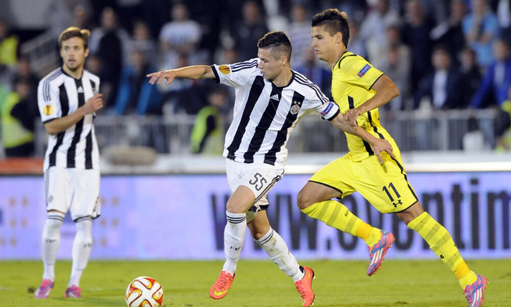 DANILO PANTIC, fudbaler Partizana, na utakmici UEFA Liga Evrope protiv Totenhem Hotspura, i ERIK LAMELA, na stadionu Partizana. Beograd, 18.09.2014. Foto: Nebojsa Parausic Fudbal, Partizan, UEFA Liga Evropa, Totenhem Hotspur