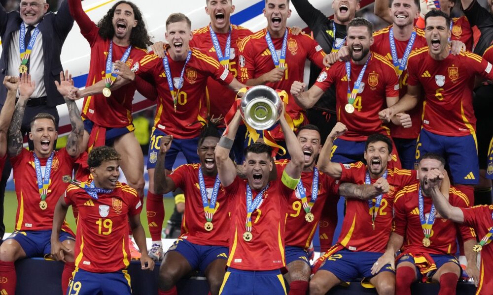 Spain's Alvaro Morata holds the trophy as he celebrates with his teammates after winning the final match between Spain and England at the Euro 2024 soccer tournament in Berlin, Germany, Sunday, July 14, 2024. Spain won 2-1. (AP Photo/Frank Augstein)