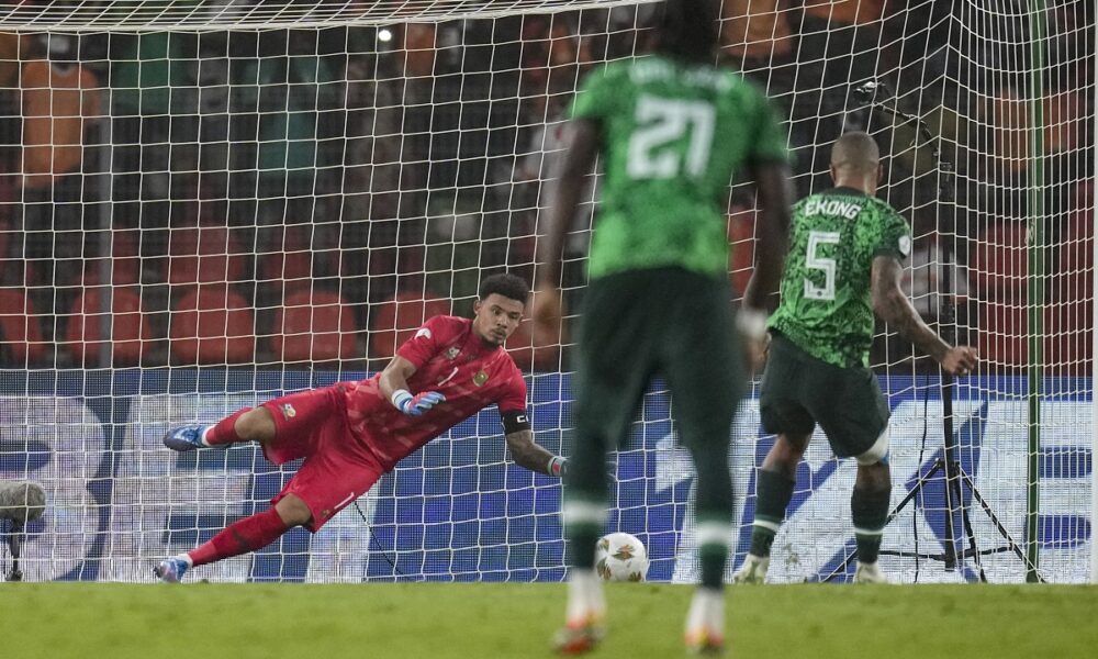 Nigeria's William Troost-Ekong, scores his side's first goal from the penalty spot during the African Cup of Nations semifinal soccer match between Nigeria and South Africa, at the Peace of Bouake stadium in Bouake Bouake, Ivory Coast, Wednesday, Feb. 7, 2024. (AP Photo/Themba Hadebe)