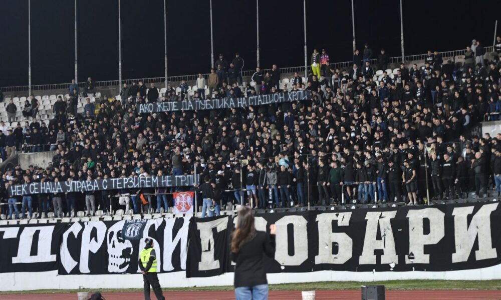 – Ako žele da publika na stadion hrli, nek se naša uprava s Terzićem ne grli – napisali su Grobari na paroli koju su podigli na svojoj tribini.