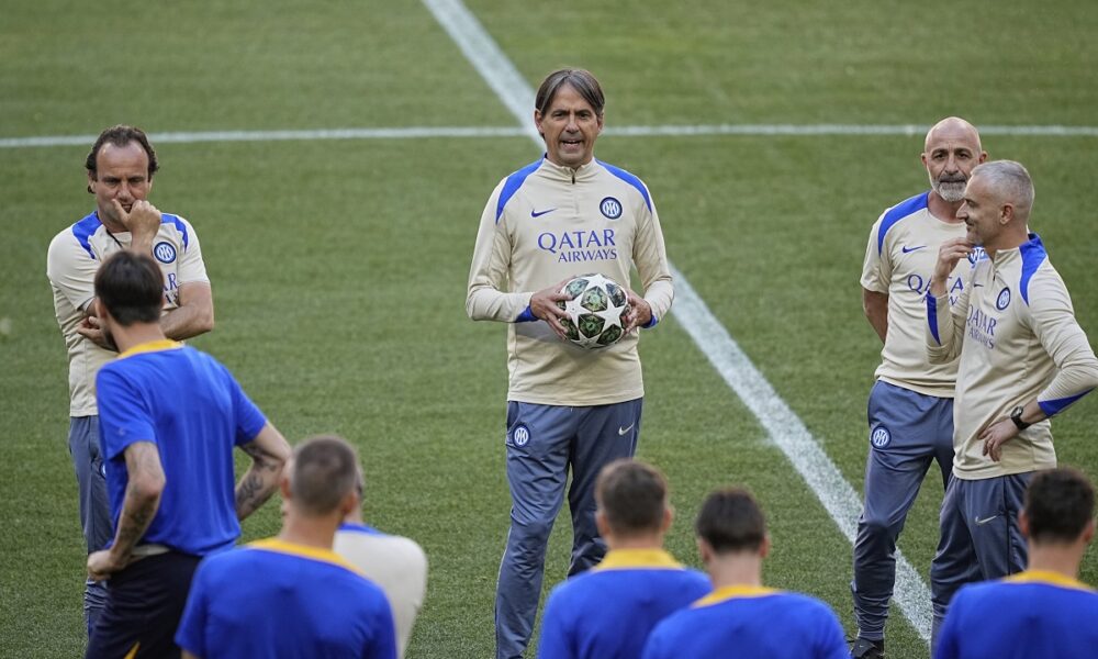 Inter Milan's head coach Simone Inzaghi, center, speaks with his players during a training session ahead of the Champions League final soccer match between Paris Saint-Germain and Inter Milan in Munich, Germany, Friday, May 30, 2025. (AP Photo/Martin Meissner)