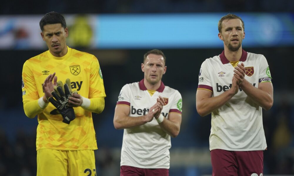 Players of West Ham react to loosing, at the end of a English Premier League soccer match against Manchester City at Etihad stadium in Manchester, England, Saturday, Jan. 4, 2025. (AP Photo/Ian Hodgson)