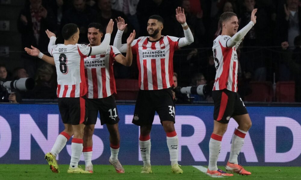PSV's Ismael Saibari second right, celebrates with a teammates after scoring his sides fifth goal during the Champions League opening phase soccer match between PSV and Napoli in Eindhoven, Netherlands,Tuesday, Oct. 21, 2025. (AP Photo/Patrick Post)
