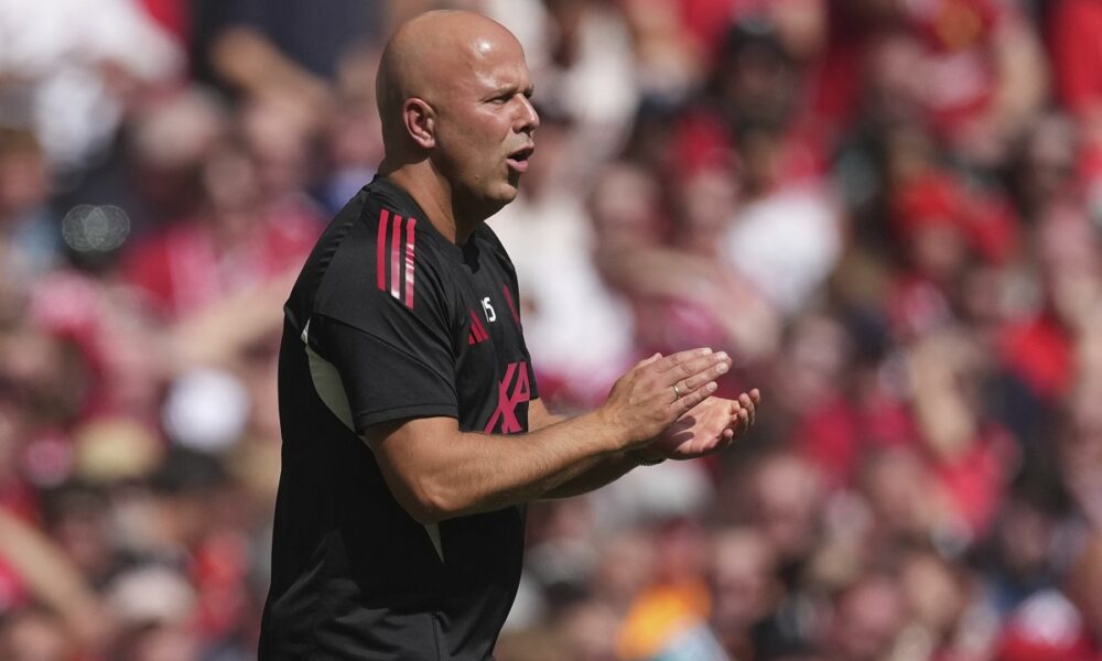 Liverpool's manager Arne Slot reacts during the FA Community Shield final soccer match between Liverpool and Crystal Palace at Wembley Stadium in London,Sunday, Aug. 10, 2025. (AP Photo/Dave Shopland)