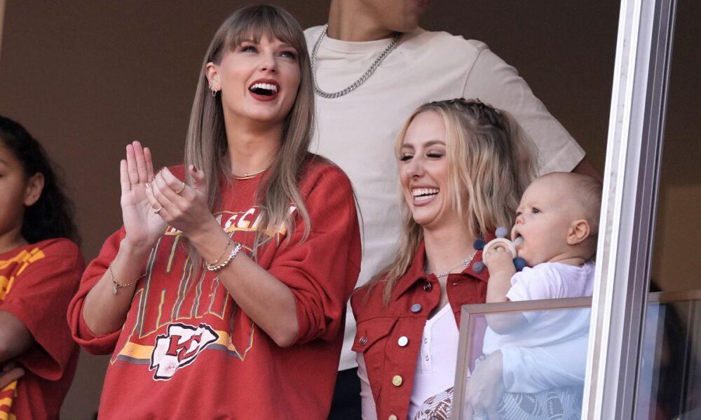 Taylor Swift cheers alongside Brittany Mahomes, right, before the start of an NFL football game between the Kansas City Chiefs and the Los Angeles Chargers Sunday, Oct. 22, 2023, in Kansas City, Mo. (AP Photo/Charlie Riedel)