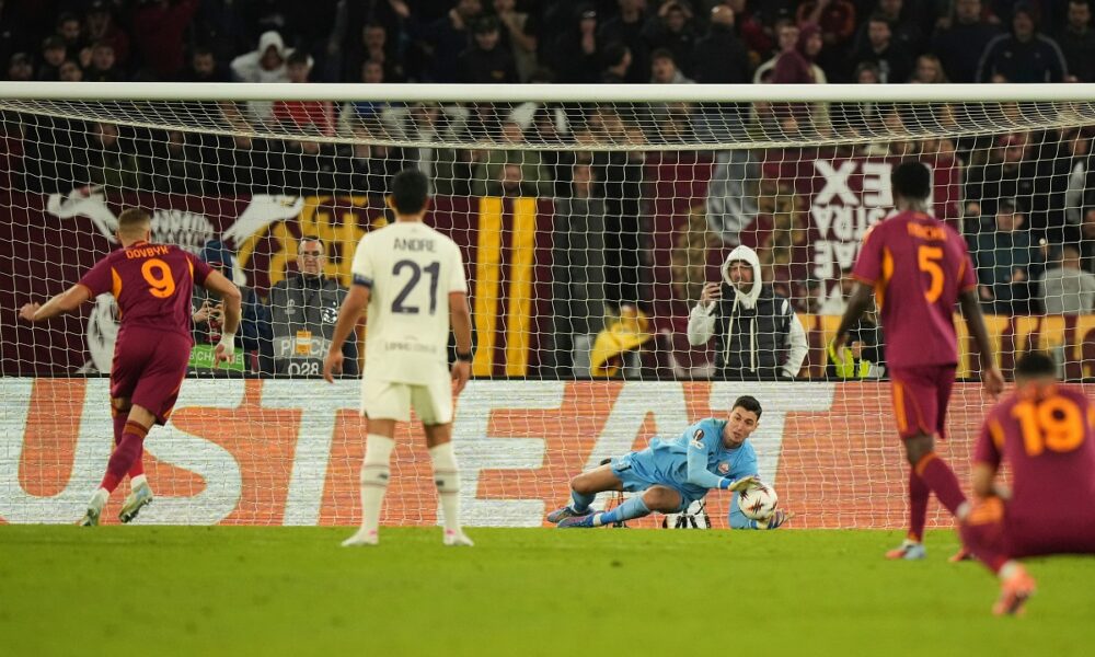 CORRECTS ID TO BERKE ÖZER, NOT MILE SVILAR - Lille goalkeeper Berke Özer saves a penalty kicked by Roma's Artem Dovbyk during the Europa League Europa League soccer match between AS Roma and Lille at the Olympic stadium in Rome, Thursday, Oct. 2, 2025. (AP Photo/Andrew Medichini)