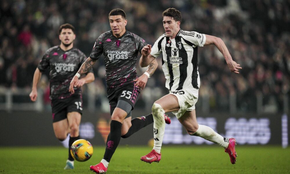 Empoli's Luca Marianucci, left, and Juventus' Dusan Vlahovic battle for the ball during an Italian Cup quarterfinal soccer match between Juventus and Empoli at the Allianz Stadium in Turin, Italy, Wednesday, Feb. 26, 2025 (Marco Alpozzi/LaPresse via AP)