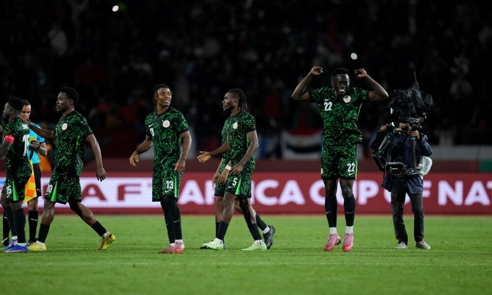 Nigeria national team react after winning on penalties during the Africa Cup of Nations third place game between Egypt and Nigeria in Casablanca, Morocco, Saturday, Jan. 17, 2026. (AP Photo/Themba Hadebe)
