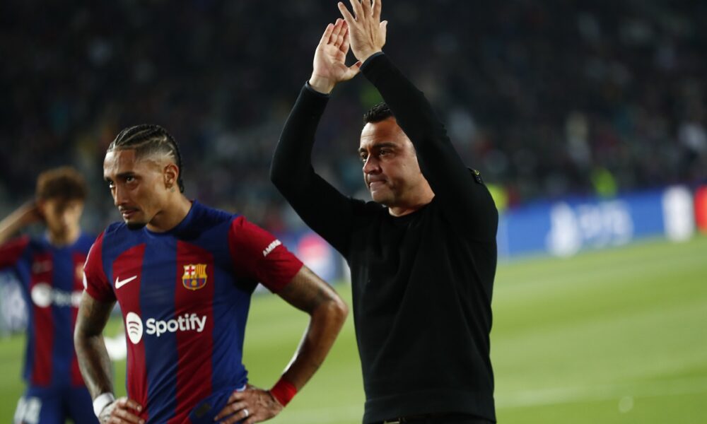 Barcelona's head coach Xavi Hernandez, right, and Barcelona's Raphinha salute supporters at the end of the Champions League quarterfinal second leg soccer match between Barcelona and Paris Saint-Germain at the Olimpic Lluis Companys stadium in Barcelona, Spain, Tuesday, April 16, 2024. (AP Photo/Joan Monfort)