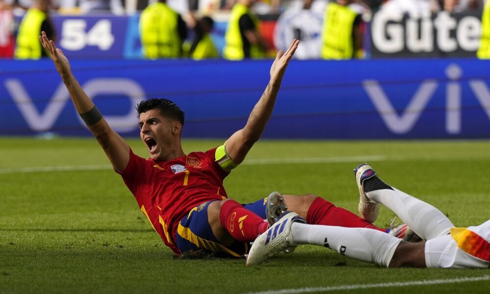 Spain's Alvaro Morata gestures during a quarter final match between Germany and Spain at the Euro 2024 soccer tournament in Stuttgart, Germany, Friday, July 5, 2024. (AP Photo/Manu Fernandez)