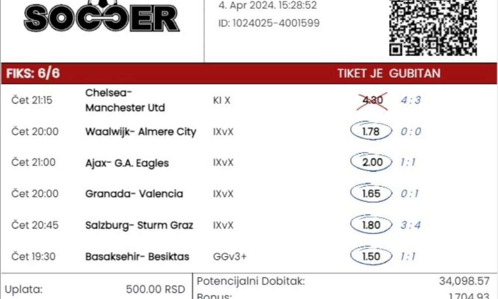 Jedan od parova na zanimljivom tiketu je bio upravo meč koji je odigran na Stamford Bridžu, a ispostavilo se da je tamo čekao nerešen ishod za isplatu od blizu 36.000 dinara na uloženih 500.
