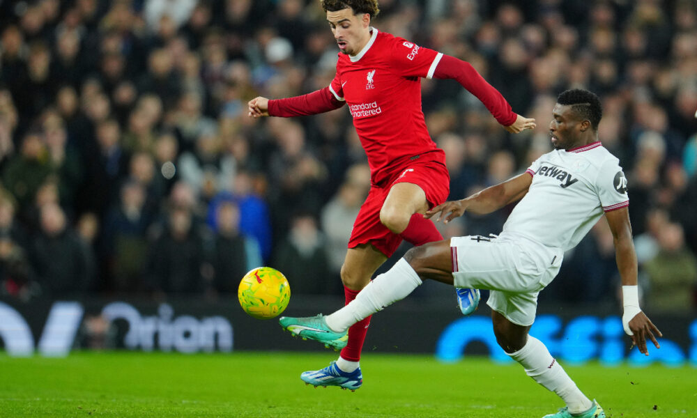 West Ham's Mohammed Kudus, right, and Liverpool's Curtis Jones battle for the ball during the English League Cup quarterfinal soccer match between Liverpool and West Ham United at the Anfield stadium in Liverpool, England, Wednesday, Dec. 20, 2023. (AP Photo/Jon Super)