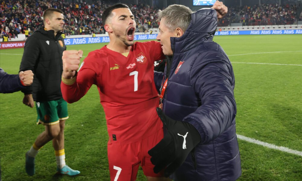 NEMANJA RADONJIC i DRAGAN STOJKOVIC PIKSI selektor i trener fudbalera reprezentacije Srbije na utakmici kvalifikacija za UEFA Evropsko prvenstvo 2024 godine protiv Bugarske na stadionu Dubocica, Leskovac 19.11.2023. godine Foto: Marko Metlas Fudbal, Reprezentacija, Srbija, Bugarska, UEFA Evropsko prvenstvo, EURO 2024