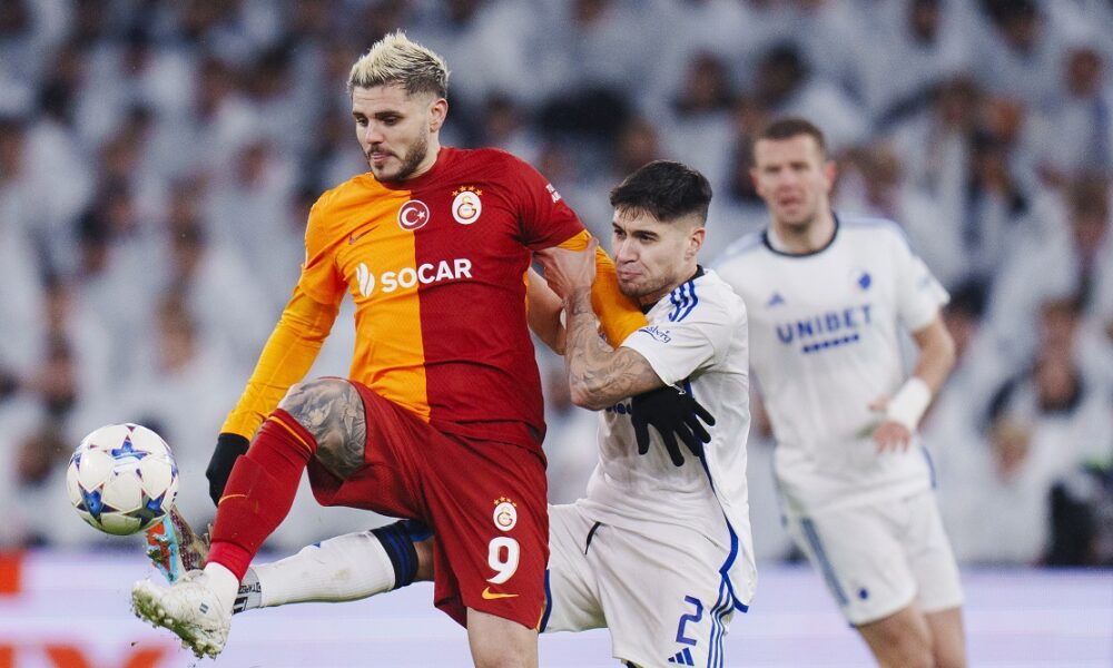 Copenhagen's Kevin Diks, center right, and Galatasaray's Mauro Icardi fight for the ball during the Champions League Group A soccer match between FC Copenhagen and Galatasaray, at the Parken Stadium, in Copenhagen, Tuesday, Dec. 12, 2023. (Liselotte Sabroe/Ritzau Scanpix via AP)
