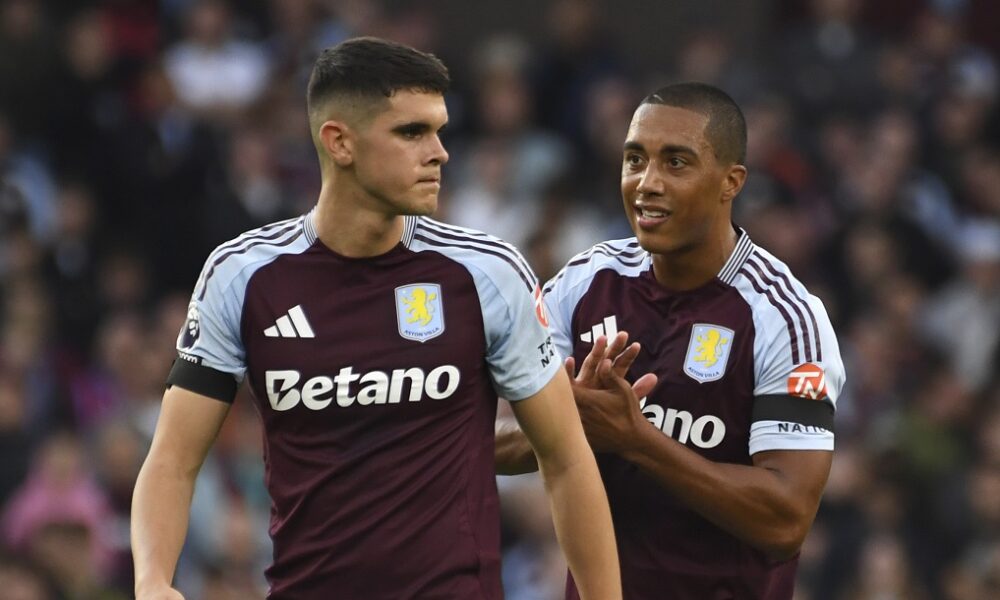 Aston Villa's Kosta Nedeljkovic, left, and Aston Villa's Youri Tielemans during the English Premier League soccer match between Aston Villa and Arsenal at Villa Park in Birmingham, England, Saturday, Aug. 24, 2024. (AP Photo/Rui Vieira)