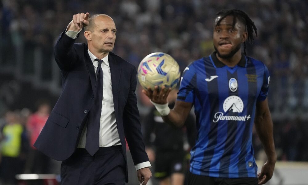 Juventus' head coach Massimiliano Allegri gives directions to his players during the Italian Cup final soccer match between Atalanta and Juventus at Rome's Olympic Stadium, Wednesday, May 15, 2024. (AP Photo/Gregorio Borgia)