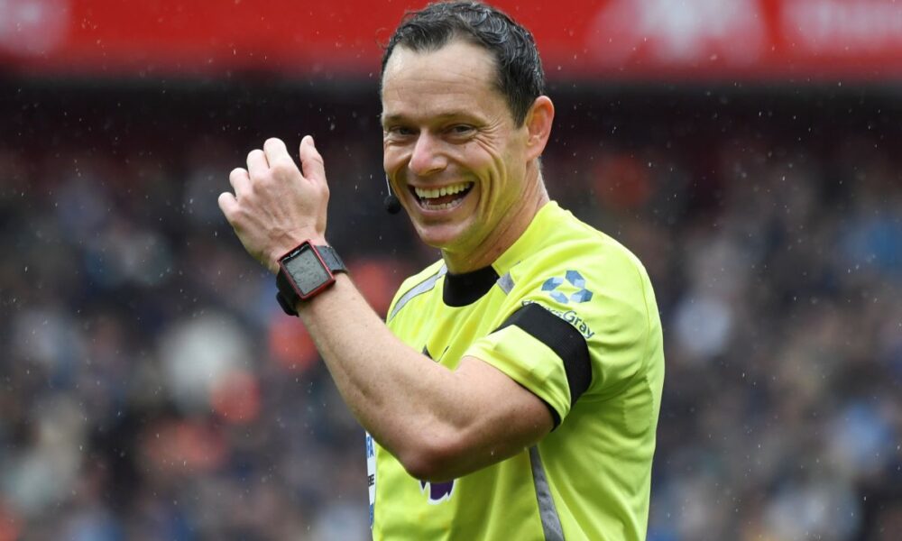 Referee Darren England smiles during the English Premier League soccer match between Liverpool and Everton at Anfield stadium in Liverpool, England, Saturday, Sept. 20, 2025. (AP Photo/Rui Vieira)