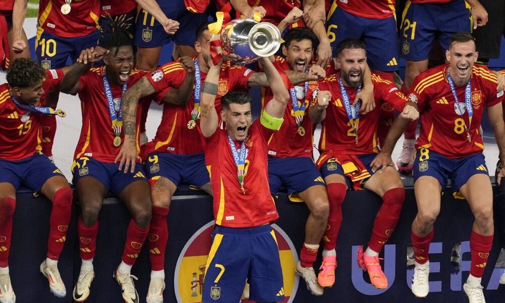 Spain's Alvaro Morata lifts the trophy after winning the final match between Spain and England at the Euro 2024 soccer tournament in Berlin, Germany, Sunday, July 14, 2024. (AP Photo/Andreea Alexandru)