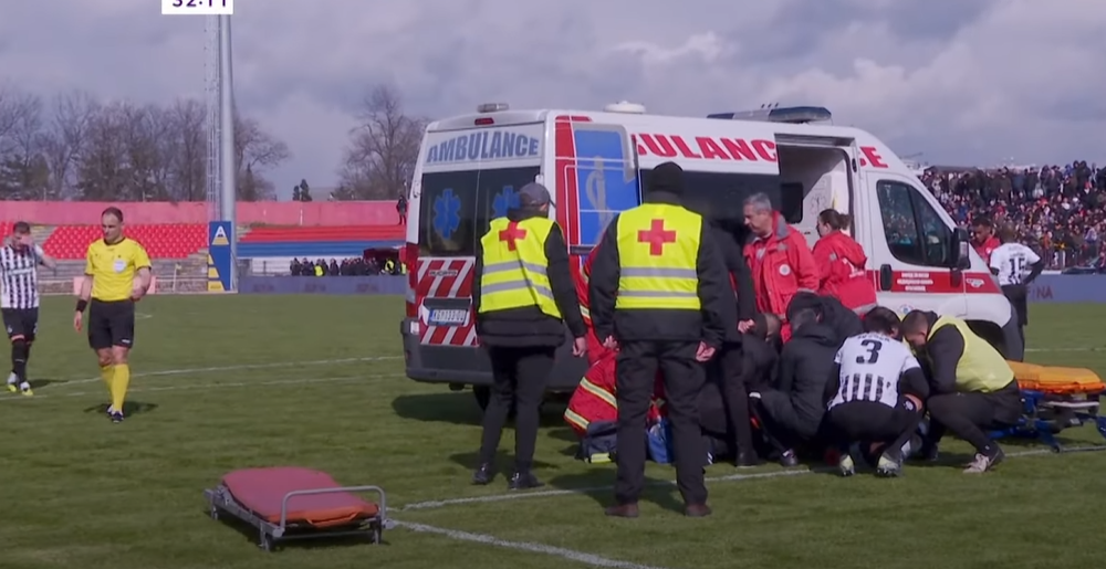 Krilni napadač je posle jedne akcije i duela sa fudbalerom domaćih Bevisom ostao da leži na travi, jaučići u bolovima. Nekoliko minuta trajale su neprijatne scene dok mu je ukazana pomoć, a zatim je kolima Hitne pomoći odvezen sa terena i otpremljen verovatno u bolnicu u Kragujevcu.