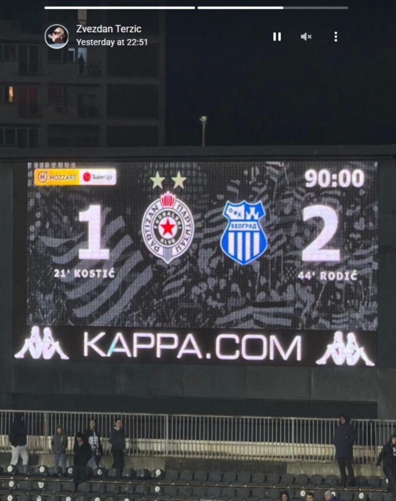 Terzić je posle trijumfa “romantičara” golom u 95. minutu, na društvenim mrežama objavio dve fotografije. Jednu iz lože stadiona u Humskoj koju su trijumfalno napustili njegovi potomci i drugu semafora na kome stoji konačan rezultat – 2:1 za plavo-bele.