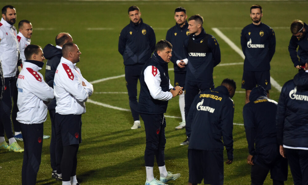 DEJAN MILOJEVIC i fudbaleri Crvene zvezde, na treningu pred utakmicu UEFA Lige Sampiona protiv Stutgarta na pomocnom terenu stadiona Rajko Mitic. Beograd 26.11.2024. foto: Nebojsa Parausic Fudbal, Liga sampiona, Crvena zvezda, Stutgart