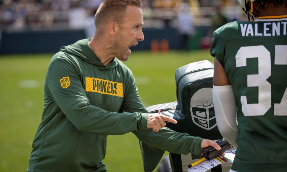 Green Bay Packers' defensive coordinator Jeff Hafley talks to players during NFL football training camp Saturday, July. 27, 2024, in Green Bay, Wis. (AP Photo/Mike Roemer)