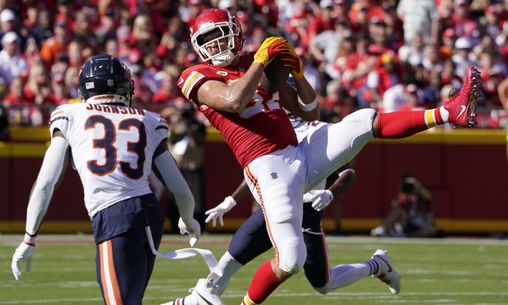 Kansas City Chiefs tight end Travis Kelce catches a pass as Chicago Bears cornerback Jaylon Johnson (33) defends during the first half of an NFL football game Sunday, Sept. 24, 2023, in Kansas City, Mo. (AP Photo/Ed Zurga)