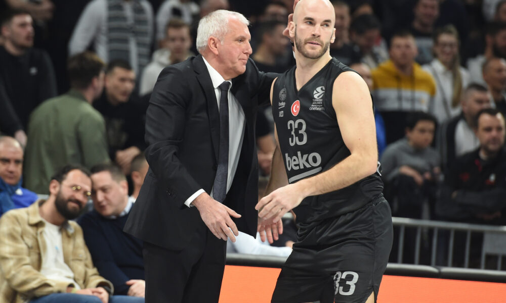 ZELJKO OBRADOVIC, trener kosarkasa Partizana, na utakmici Evrolige protiv Fenerbahcea, i NICK CALATHES i Nik Kalates u Beogradskoj Stark areni. Beograd, 23.02.2023. foto: Nebojsa Parausic Kosarka, Euroleague, Partizan, Fenerbahce