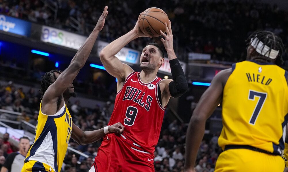 Chicago Bulls center Nikola Vucevic (9) shoots between Indiana Pacers forward Aaron Nesmith (23) and guard Buddy Hield (7) during the second half of an NBA basketball game in Indianapolis, Monday, Oct. 30, 2023. The Bulls defeated the Pacers 112-105. (AP Photo/Michael Conroy)
