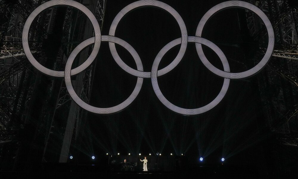 Celine Dion performs on the Eiffel Tower in Paris, France, during the opening ceremony of the 2024 Summer Olympics, Friday, July 26, 2024. (AP Photo/Natacha Pisarenko)