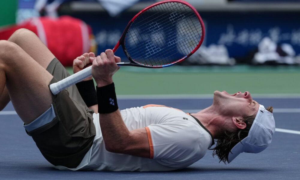 Zizou Bergs, of Belgium, reacts after defeating Gabriel Diallo, of Canada in the men's singles match of the Shanghai Masters tennis tournament at Qizhong Forest Sports City Tennis Center, in Shanghai, China, Tuesday, Oct. 7, 2025. (AP Photo/Andy Wong)