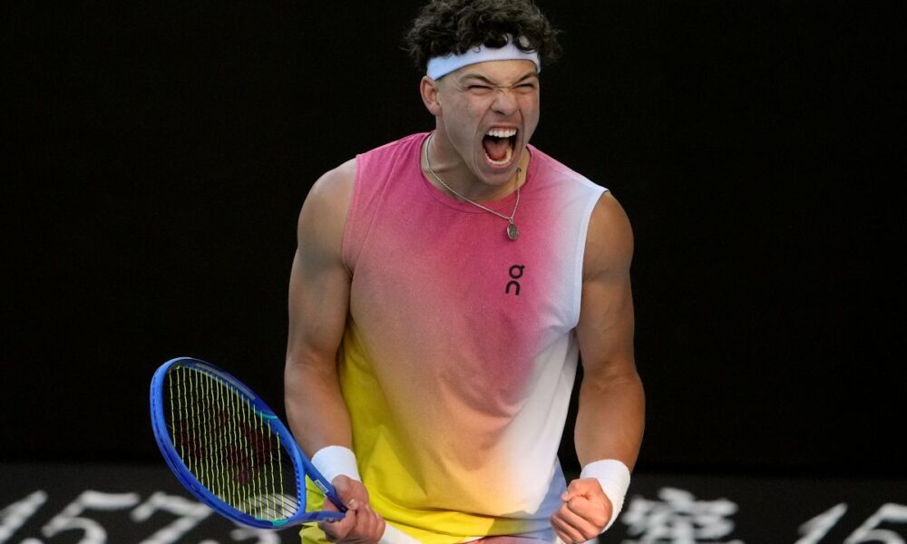 Ben Shelton of the U.S. reacts during his quarterfinal match against Lorenzo Sonego of Italy at the Australian Open tennis championship in Melbourne, Australia, Wednesday, Jan. 22, 2025. (AP Photo/Asanka Brendon Ratnayake)
