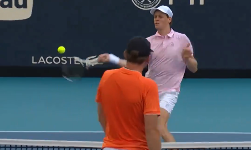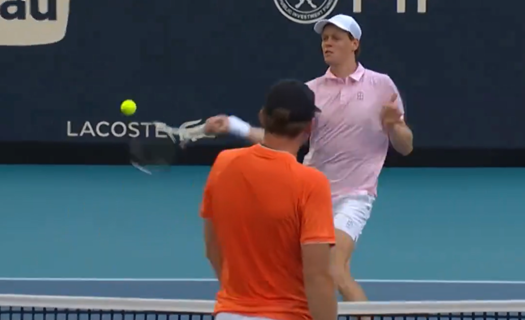 Jannik Sinner accidentally hits Alex Michelsen with a ball during their match in Miami.
